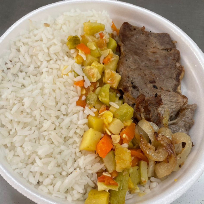 Contra Filé Acebolado na chapa. Arroz, Feijão + 2 a 3 Guarnições do Dia. Temos Tamanhos Tamanhos Maiores na Próxima Etapa.