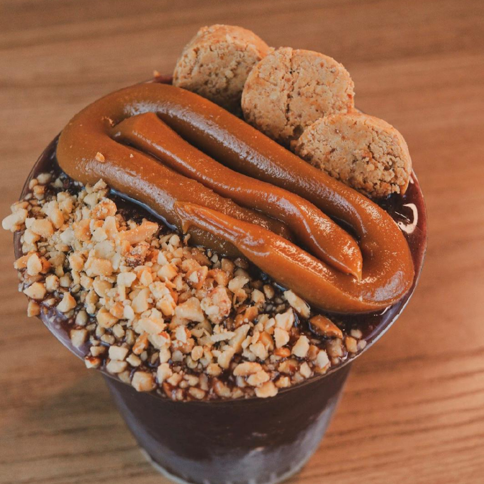 Açaí, doce de leite, paçoca e duas opções de frutas