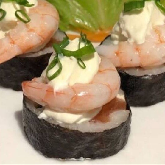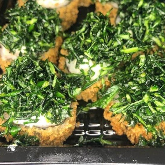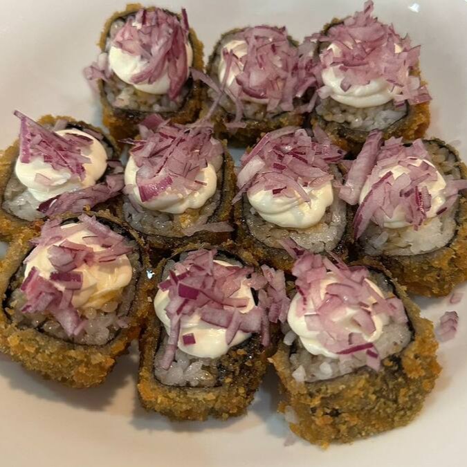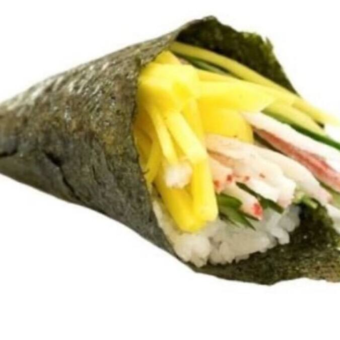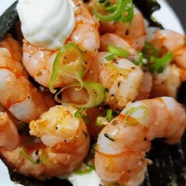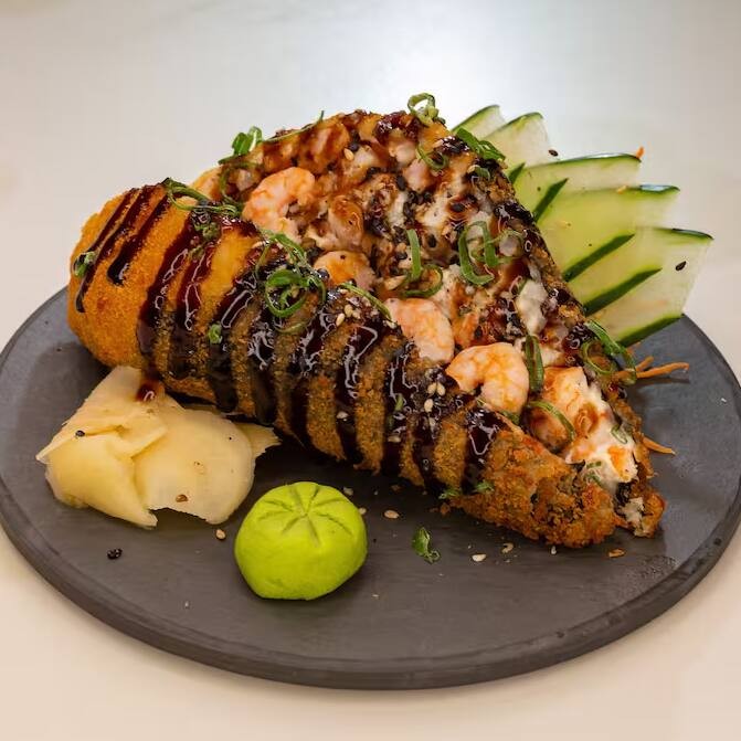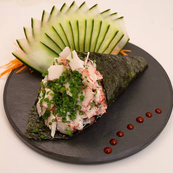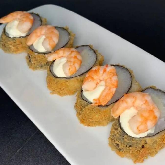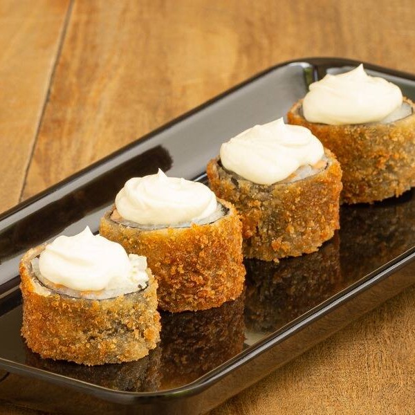 Hot temaki com arroz,cream chesse e 8un de camarao,empanado com ferinha de panko(inteiro sem corte)