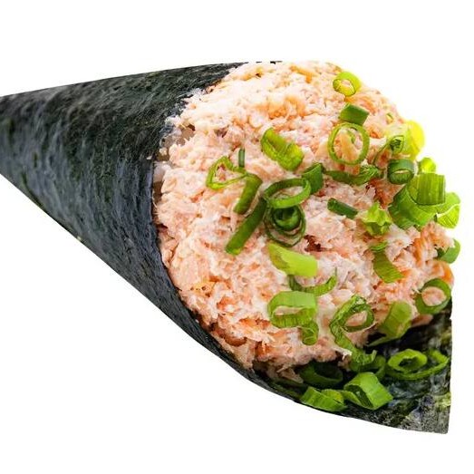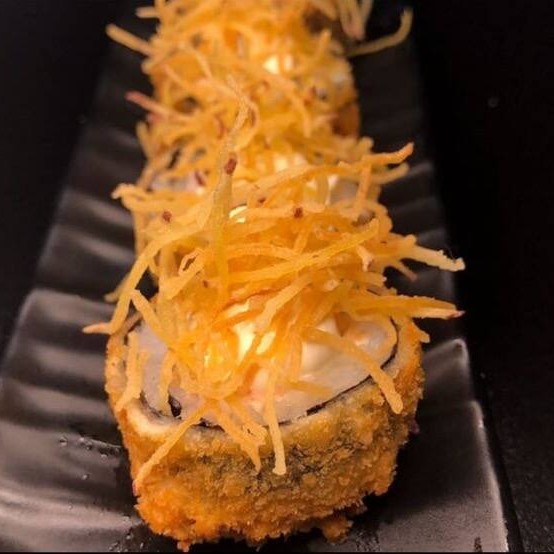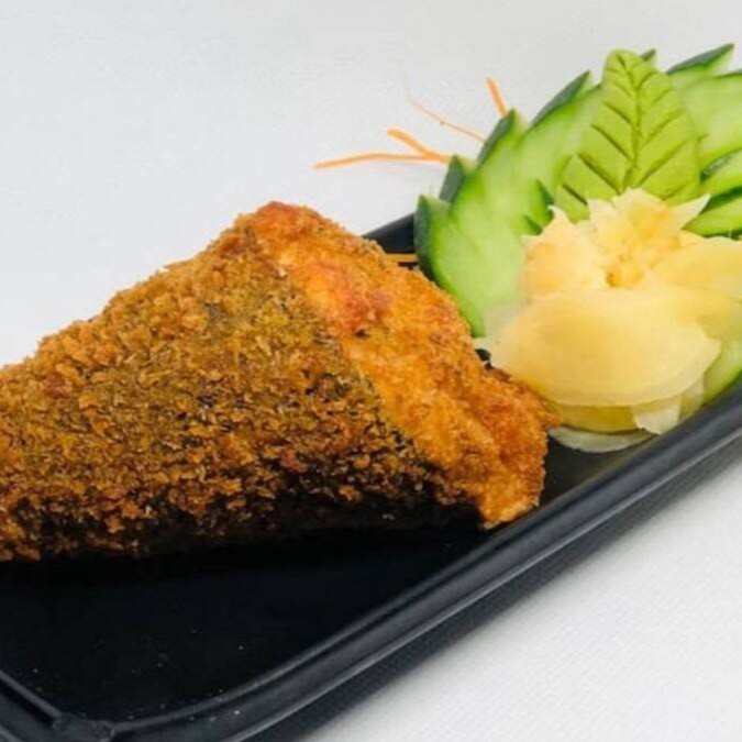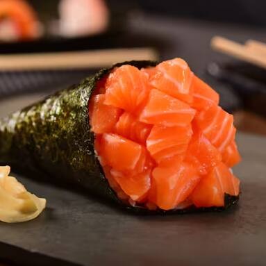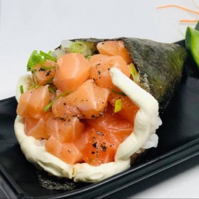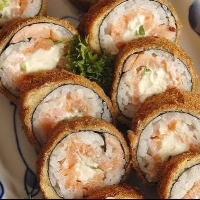 temaki com arroz,salmao grelhado,cream chesse e doridos,empanado com farinha de panko(corte ao meio)