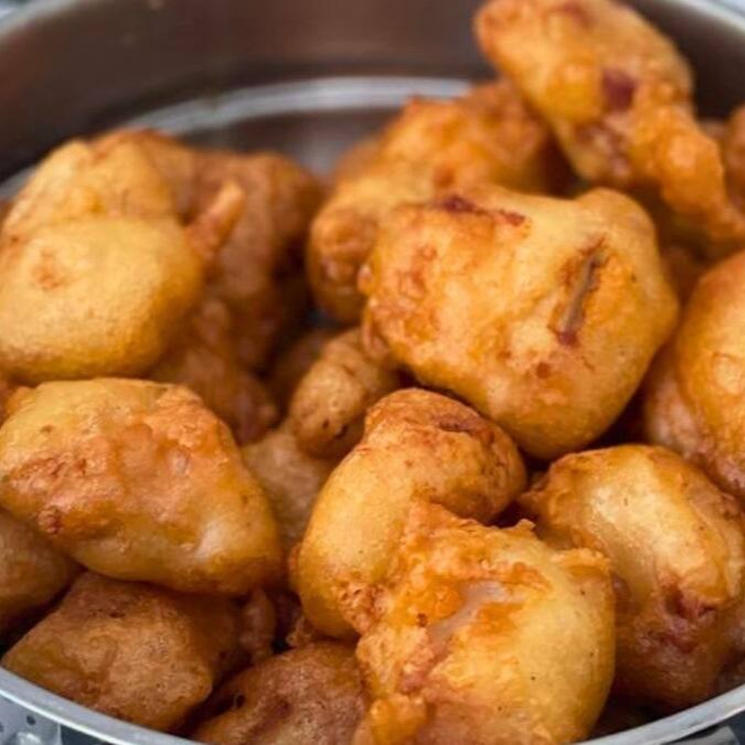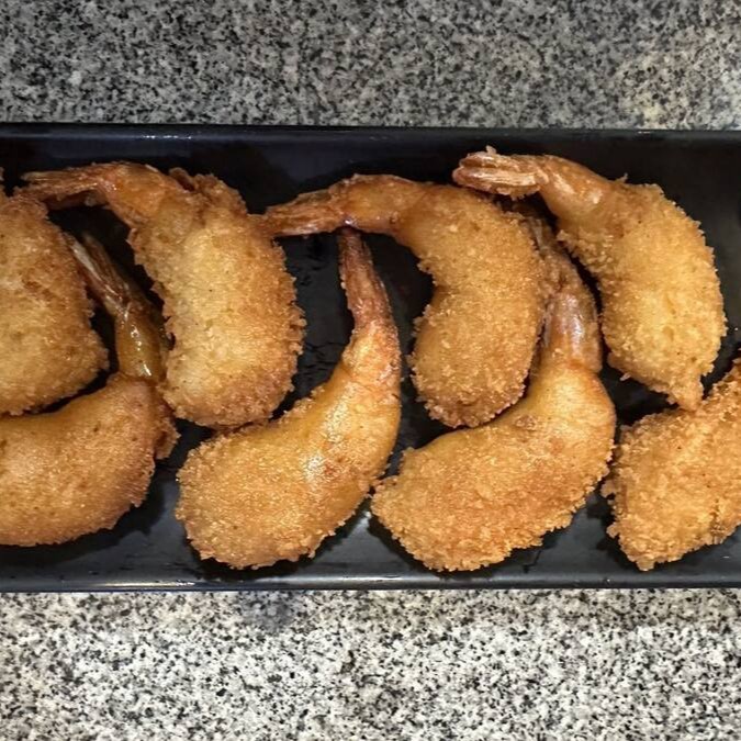O camarao apenas removeu a casca do da metade superior,deixando a casca do cauda,e empanado com farinha de rosca
