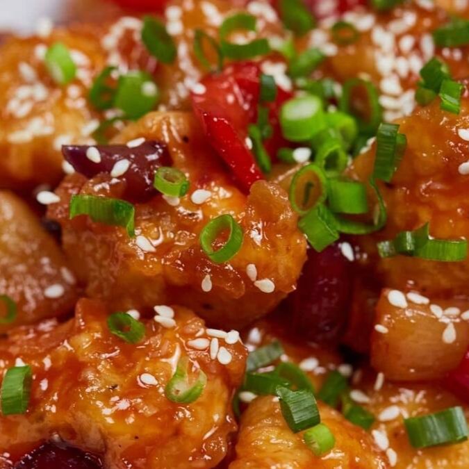 frango empanado com pimentao,cebola,gergilim e molho agridoce