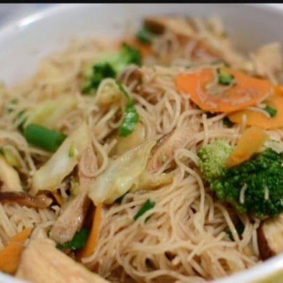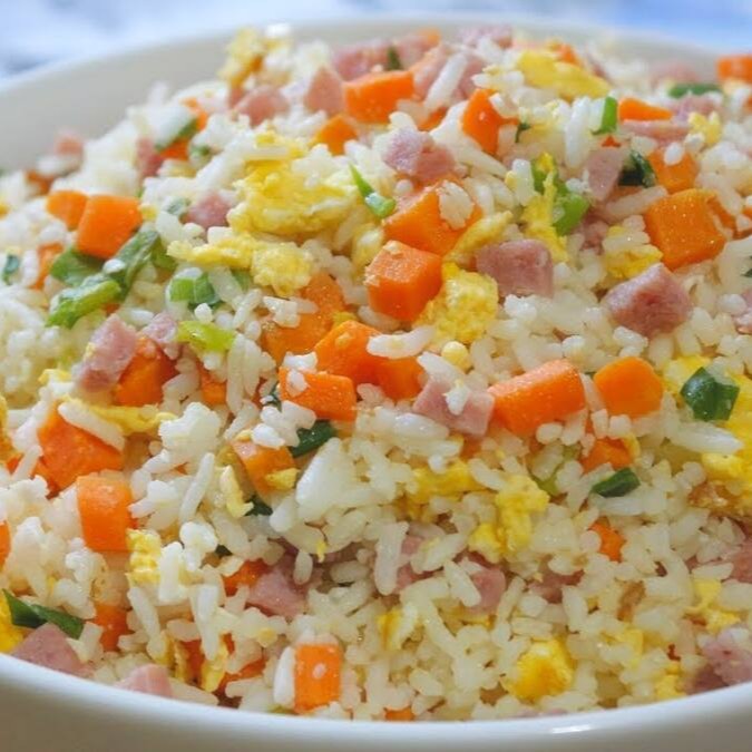 arroz frito com frango,ovo,presunto,cenoura,ervilha e cebolinha