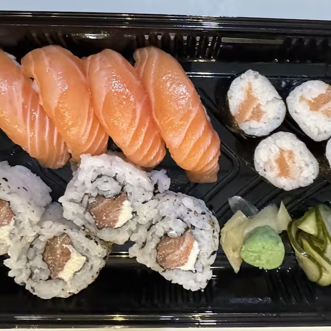 5 sashimi salmao, 8 makis salmao, 4 niguiri de salmao e 8 filadelfia