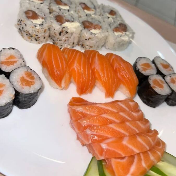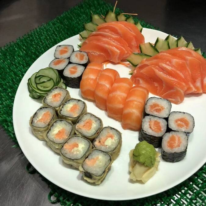 10 sashimi salmao, 8 makis salmao, 8 hot e 4 niguiri de salmao