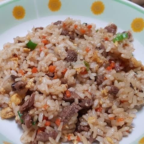 arroz frito com cenoura,ovo,carne,milho,cebolinha e ervilhas