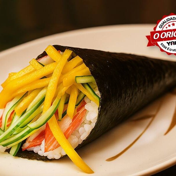 Arroz japonês temperado, Manga, Pepino, Kani-Kama (Carne Processada de Caranguejo), nori (Alga Marinha). 180g aprox.