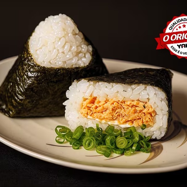 Bolinho de arroz com alga, levemente salgado. Arroz japonês cozido com água Kangen, recheado com salmão ou atum, maionese e cebolinha (alcalina). Foto meramente ilustrativa.