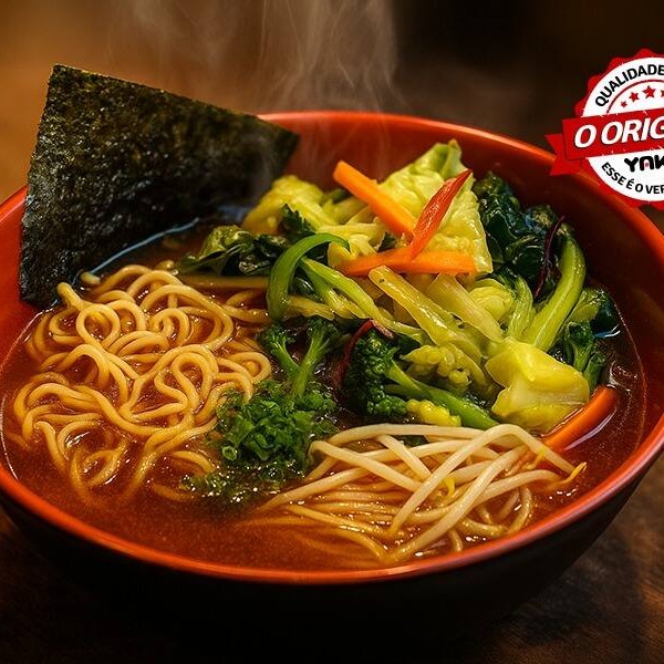 Macarrão lámen com caldo a base de legumes, acompanha legumes, cebolinha.