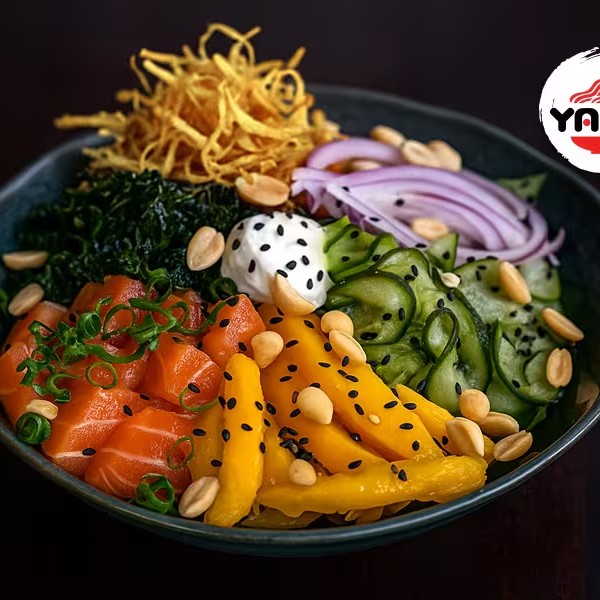 Base com arroz shari (agridoce) e alface com couve crispy, manga, pepino agridoce, cebola roxa, cream cheese, cebolinha gergelim e amendoim + Proteína