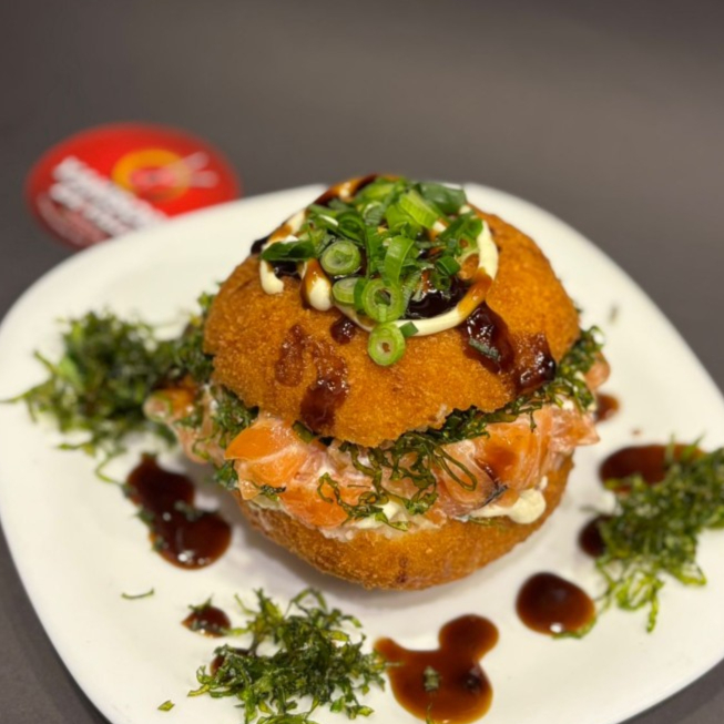 Uma explosão de sabores em cada mordida! Nosso sushi burguer é feito com dois "pães" de arroz temperado e selado, recheado com fatias generosas de salmão fresco, cream cheese cremoso, cebolinha, crispy de couve ou cecbola crispy e taré especial da casa. Um clássico japonês em formato ousado e irresistível!