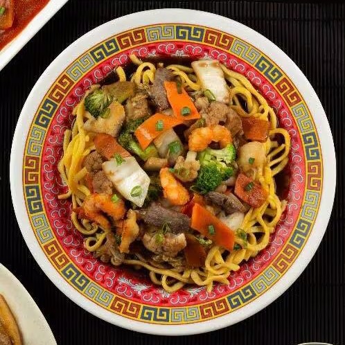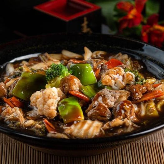 Macarrão, carne bovina, cubos de frango, camarão, acelga, brócolis, cenoura, couve-flor ao molho de soja.*hashi e acompanhamentos devem ser pedidos a parte.