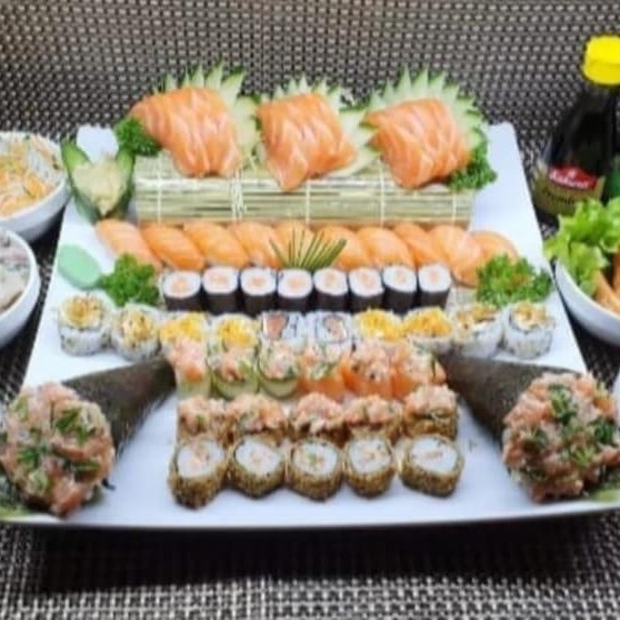 10 sashimes de salmão 1 carpatio de salmão 4 niguiri salmão 4 niguiri skin 4 hosso de pepino 4hosso de salmão 4 joy de salmão 4 joy de pepino com salmão 4 ura de salmão 4 ura de skin 1 sunomono 2 temakis de salmão 10 hot rools 1 porção de yakissoba 2 rolinho primavera 2 guioza 1 porção de bifum 1 h20 de 500ml