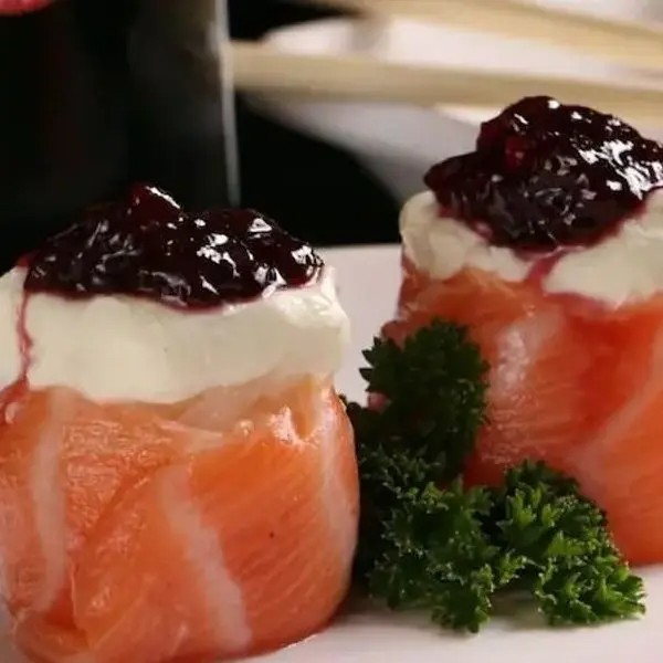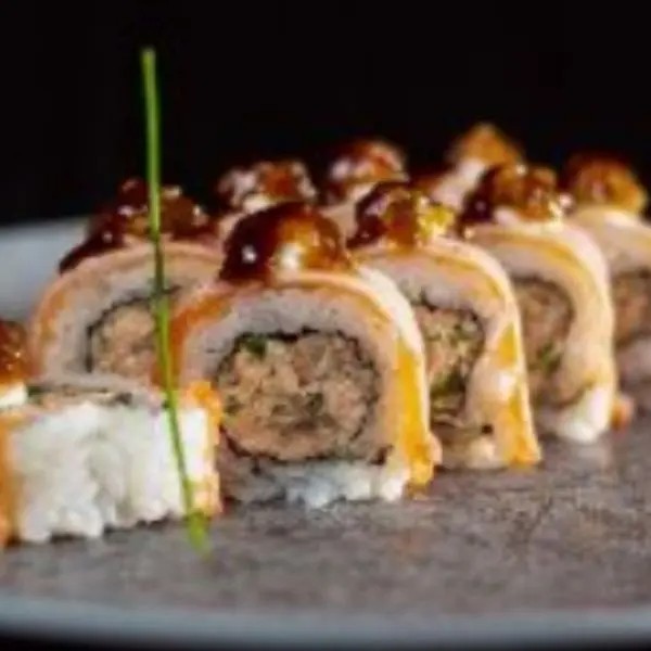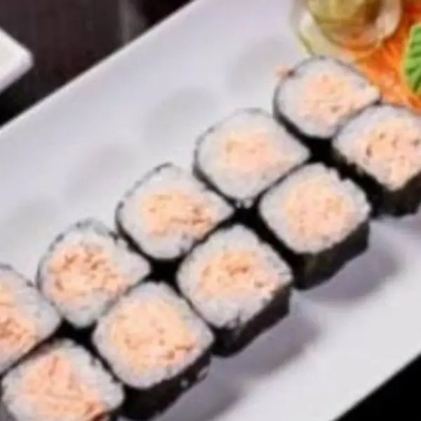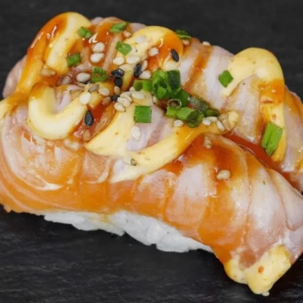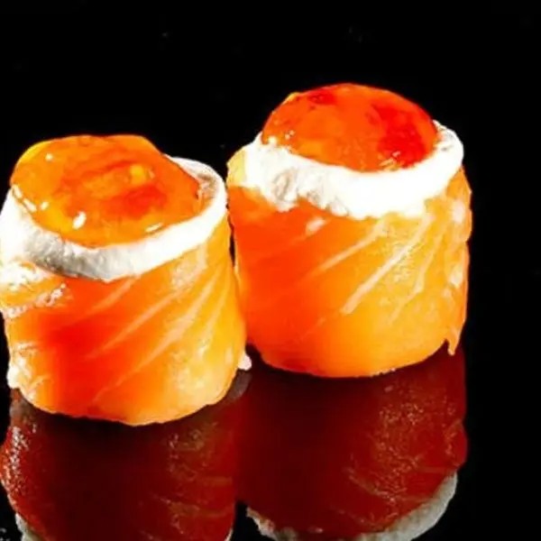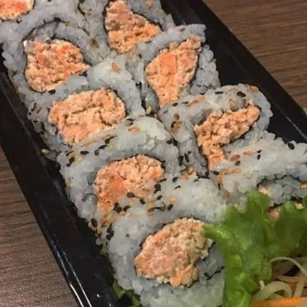 Recheio de salmão grelhado, cream cheese, cebolinha, molho tarê e salmão flambado.