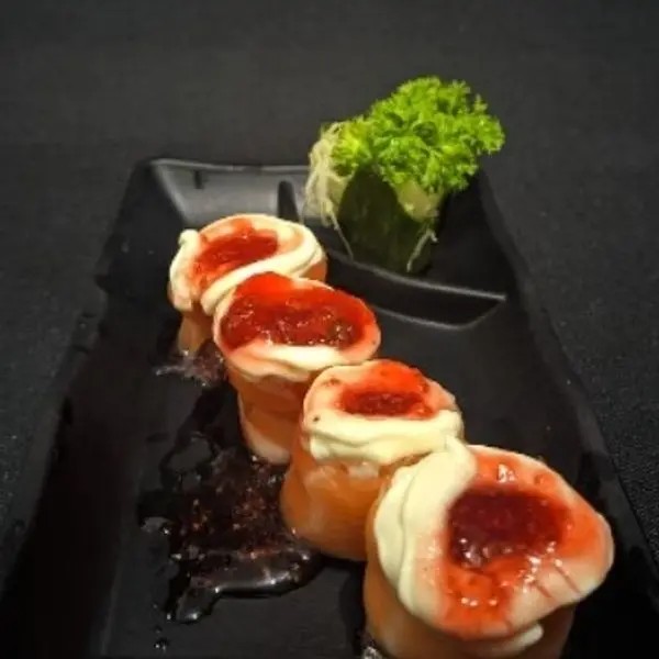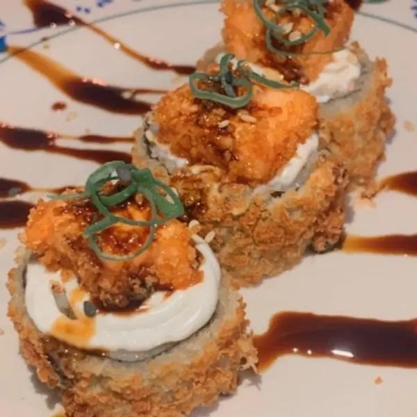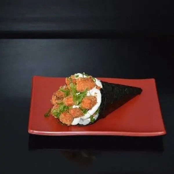 Recheio De Salmão Grelhado, Cream Cheese, Cebolinha, Molho Tarê E Cone Empanado.