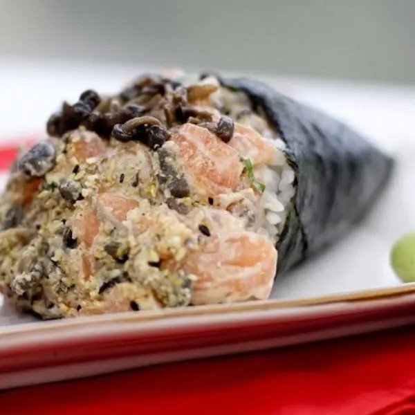 Arroz, alga, salmão grelhado, shimeji, cebolinha e cream cheese