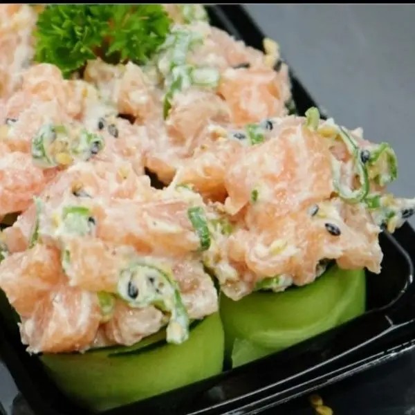 Pepino, salmão cru, arroz, cream cheese e cebolinha.