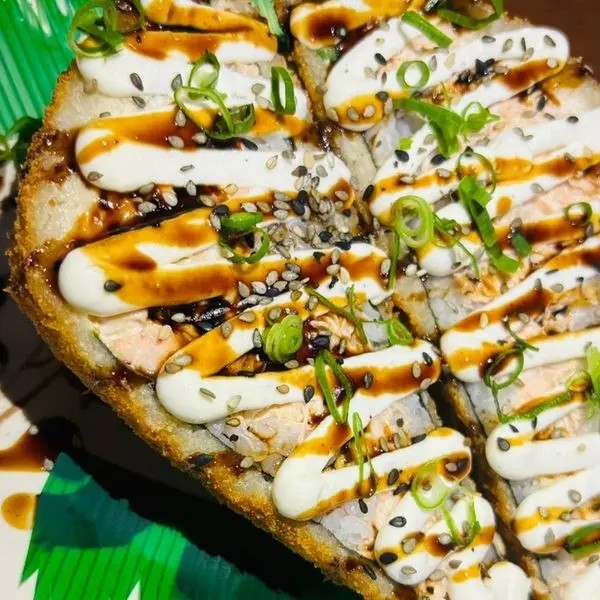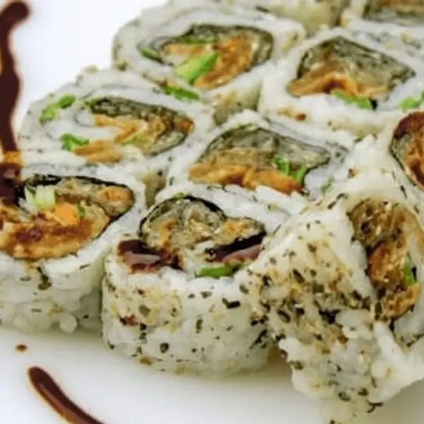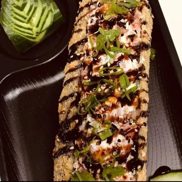 Alga, arroz, pele com salmão frito, creem cheese, molho tarê e cebolinha.