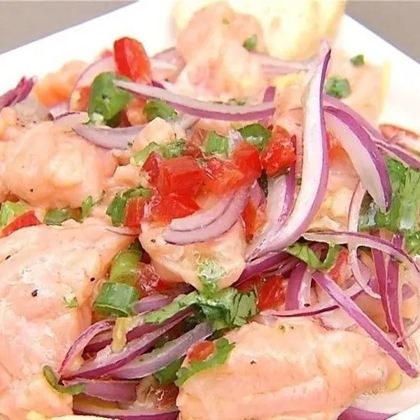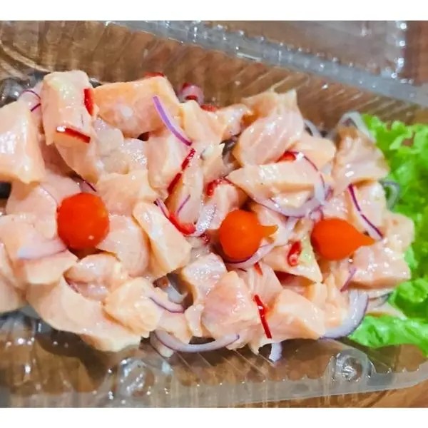 Cubos de salmão curtido no limão, pimenta suave, cebola roxa, sal e tempero do chef.