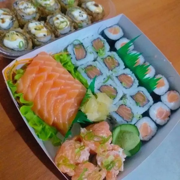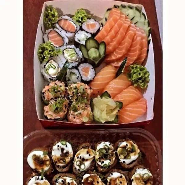 6 Sashimis, 8 Hossomakis + 8 Uramakis + 4 Dyos + 10 Hot Rolls Tradicional + 1 sunomono e 1 ceviche.