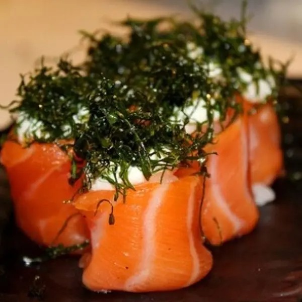 Salmão cru, cream cheese, cebolinha ,arroz e alga.