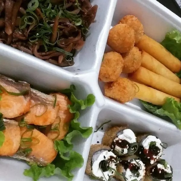4* Hot holl 4* bolinho de peixe, 4* Salmão Grelhado, 4* Harumaki Queijo, 1* Shimeji