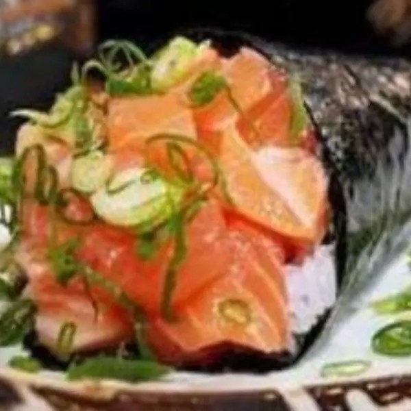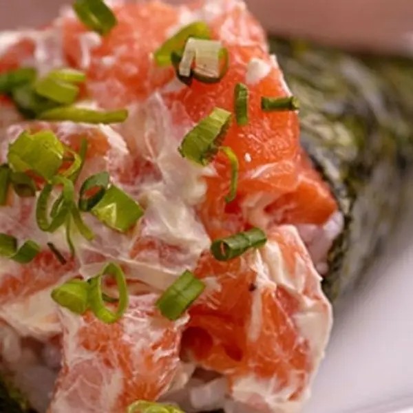 Arroz, alga, recheio de salmão grelhado, cebolinha, cream cheese.(cone empanado).