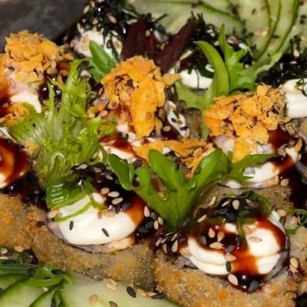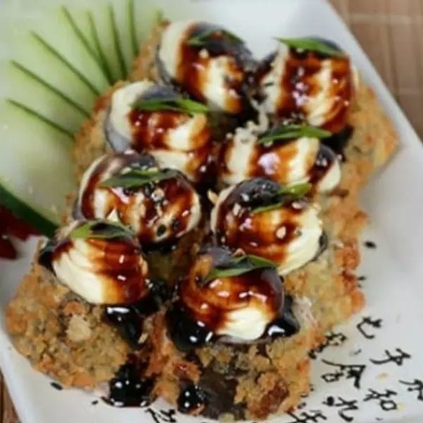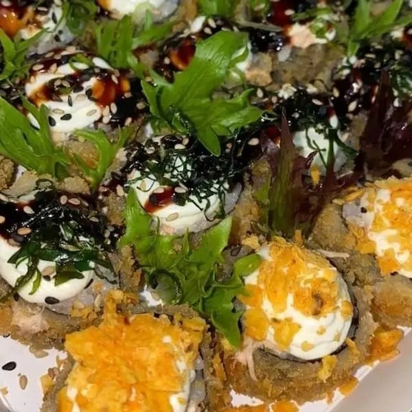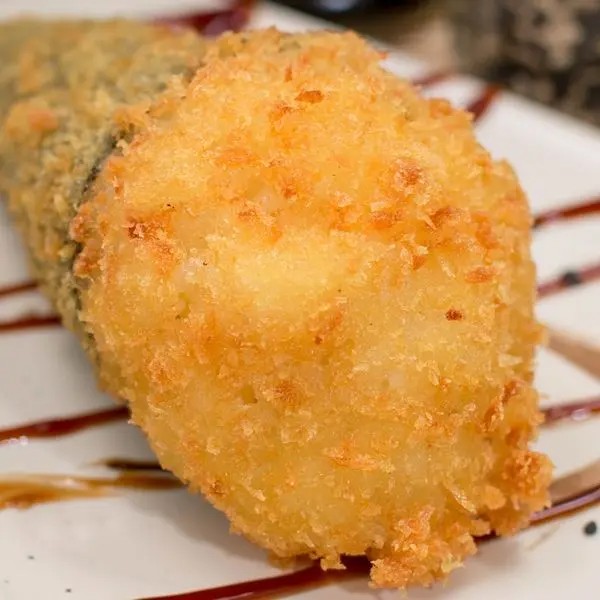 Arroz, alga, salmão empanado em cubos, cream cheese e cebolinha.