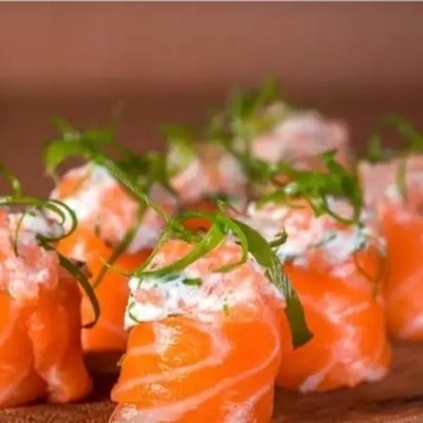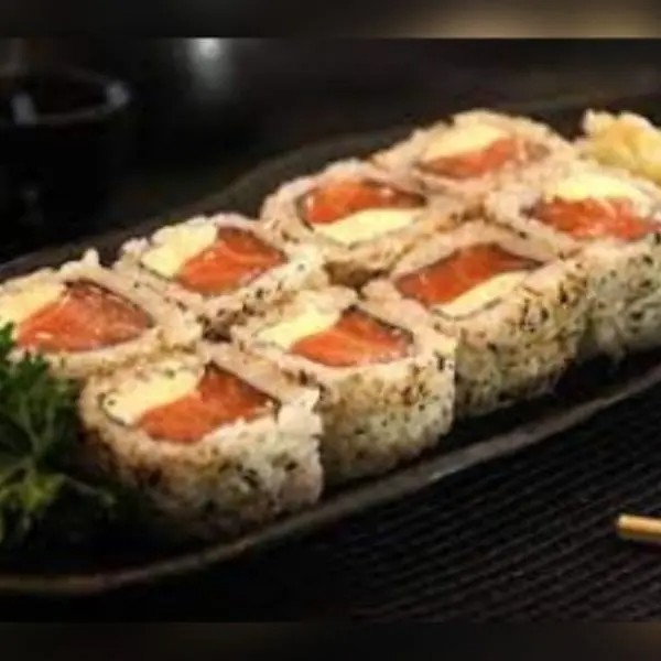 Salmão cru, arroz, cream cheese, cebolinha e alga.