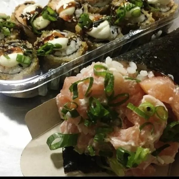 Salmão cru, cebolinha,arroz e alga.