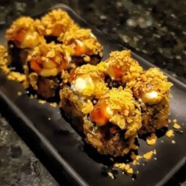 Salmão cru, arroz, cream cheese e Doritos.