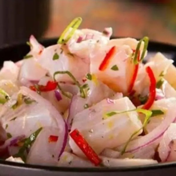 Cubos de tilápia fresca curtido no limão, cebola roxa, pimenta suave, sal e tempero do chef.