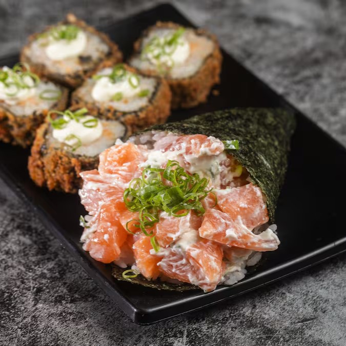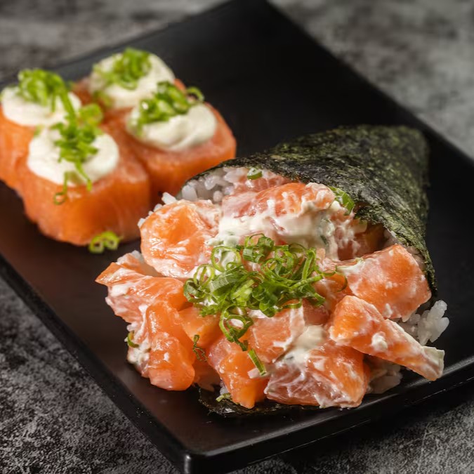 Escolha entre um temaki completo ou temaki Doritos, acompanhado de 4 joy salmão. Uma combinação perfeita para os amantes de sushi.
