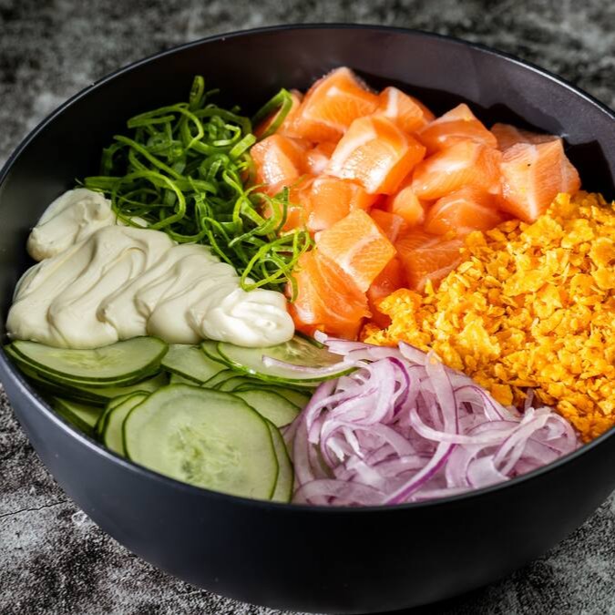 Cubos de salmão fresco, combinados com cebola roxa e pimenta, criando uma explosão de sabores vibrantes e cítricos.
