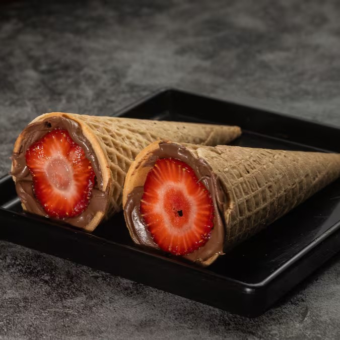 Casquinha crocante recheada de chocolate e morango, uma explosão de texturas e sabores que encanta o paladar.