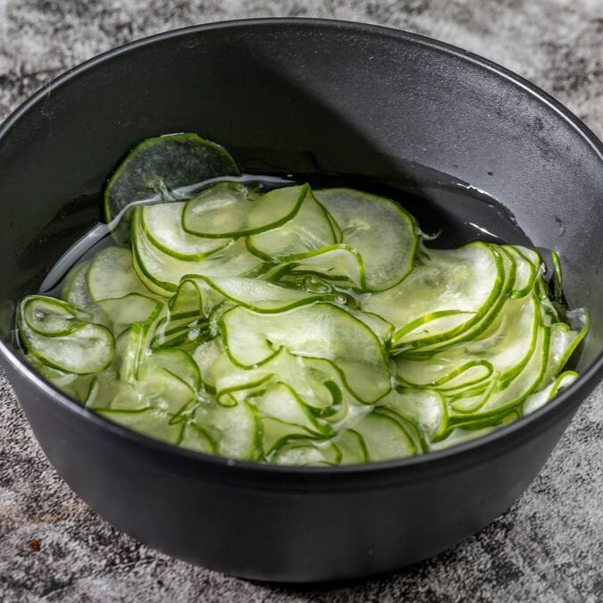 Uma salada refrescante e crocante de pepino, perfeita para abrir o apetite com seu sabor leve e equilibrado .