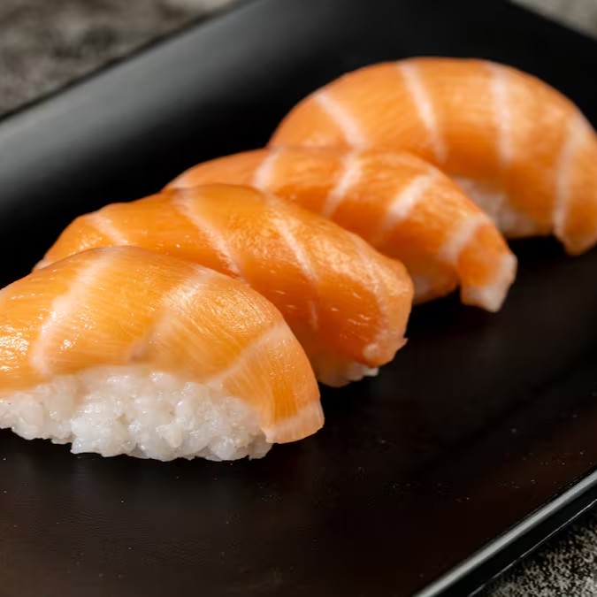 Delicie-se com o elegante niguiri de salmão, com fatias frescas de salmão sobre arroz perfeitamente cozido. Uma experiência tradicional e saborosa.