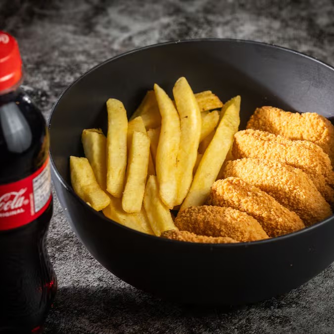 Composto por 6 nuggets crocantes, 150g de batata frita dourada e uma mini Coca-Cola. Perfeito para os pequenos.