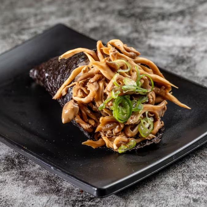 Delicie-se com o Temaki Shimeji, uma combinação elegante de arroz, shimeji e cebolinha, proporcionando uma experiência única e saborosa.