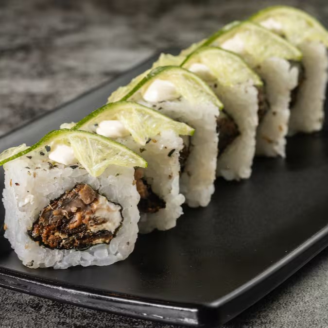 Experimente o sofisticado uramaki de salmão de skin , com arroz e alga envolvendo o salmão. Coberto com uma lamina de limao . Uma combinação harmoniosa e deliciosa de sabores.