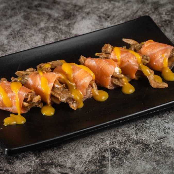 Shimeji salteado e cream cheese cremoso, envoltos em uma generosa fatia de salmão. Sabor sofisticado e irresistível!