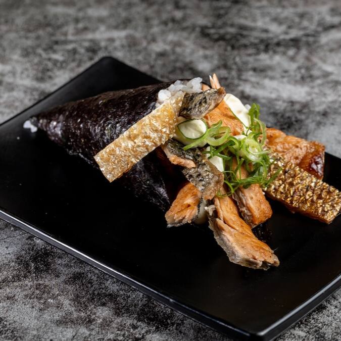 Descubra o Temaki Skin, uma combinação perfeita de arroz, pele de salmão crocante, cream cheese e cebolinha. Uma opção irresistível para quem busca sabor e textura em cada mordida.