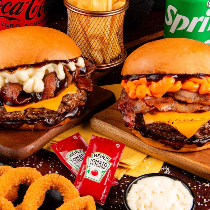 Promooo braba pra dividir e sair da rotina! A Partir R$105.99 para um banquete de respeito! A Partir Hambúrgueres Artesanais Defumados 2 Porções (Batata ou Onion Rings) 2 Coca-Cola bem geladas Tudo Isso Por A Partir R$99,90!