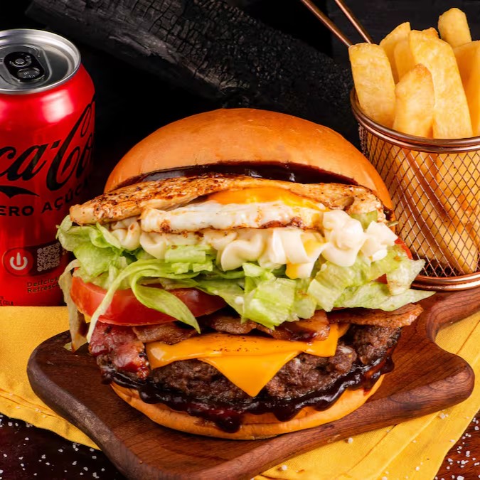 Hambúrguer Artesanal de Costela 160g Defumado / Pão Brioche Grande / Filé de Frango / Bacon em Cubos / Queijo Cheddar/ Catupiry / Molho Barbecue / Alface / Tomate / Fritas + Coca 350ml (Combo Gigante individual)