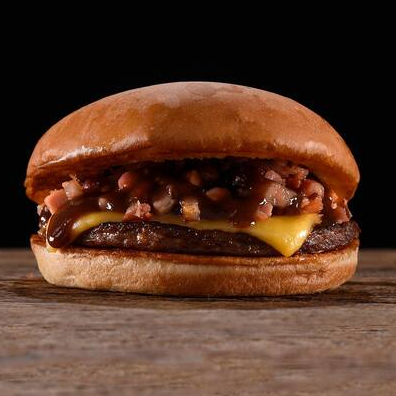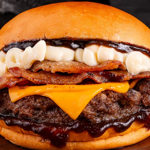 Pão Brioche, Hamburguer tradiconal 90g, queijo cheddar, bacon fatiado e molho barbecue