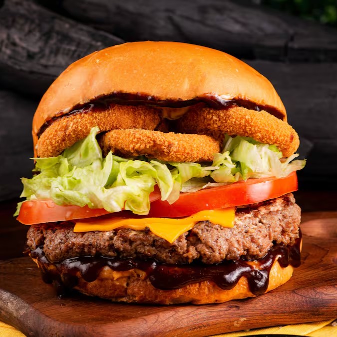Hambúrguer Artesanal de Costela 160g Defumado / Pão Brioche Grande / Cebola Empanada Onion / Queijo Cheddar / Molho Barbecue / Alface / Tomate/Acompanha sachês de ketchup e maionese Heinz e Maionese temperada