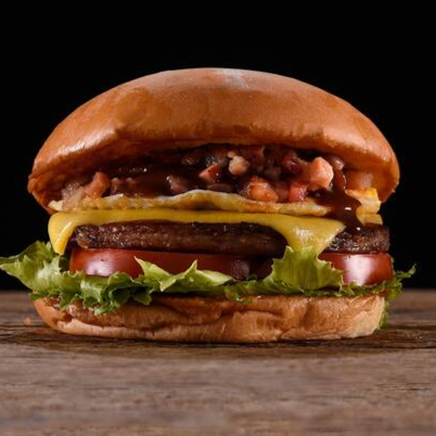 Pão Brioche, Hamburguer tradiconal 90g, queijo cheddar, ovo, bacon fatiado, alface, tomate e molho barbecue