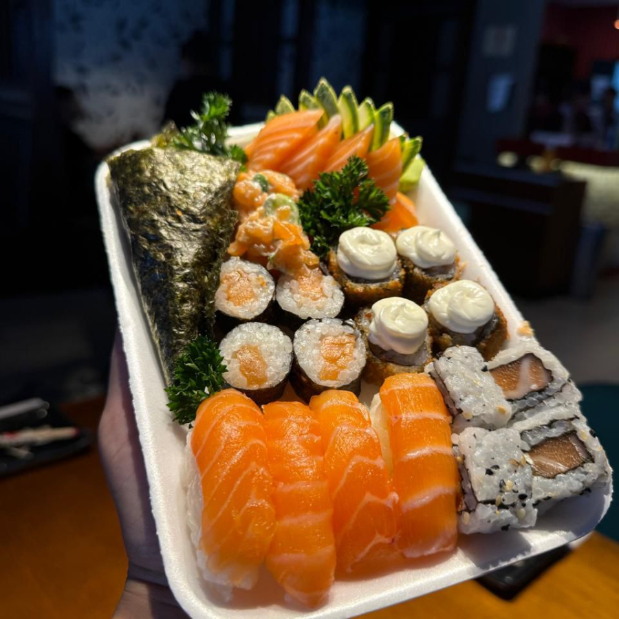 10 sashimi salmão,5 uramaki salmão,8 salmomaki,8 kanimaki,8 skin maki,6 joe kiure,5uramaki filadelfia e30 hot hols ( acompanha 3 sachê de shoyu, 3 sachê de tarê, 2 Hashi)
