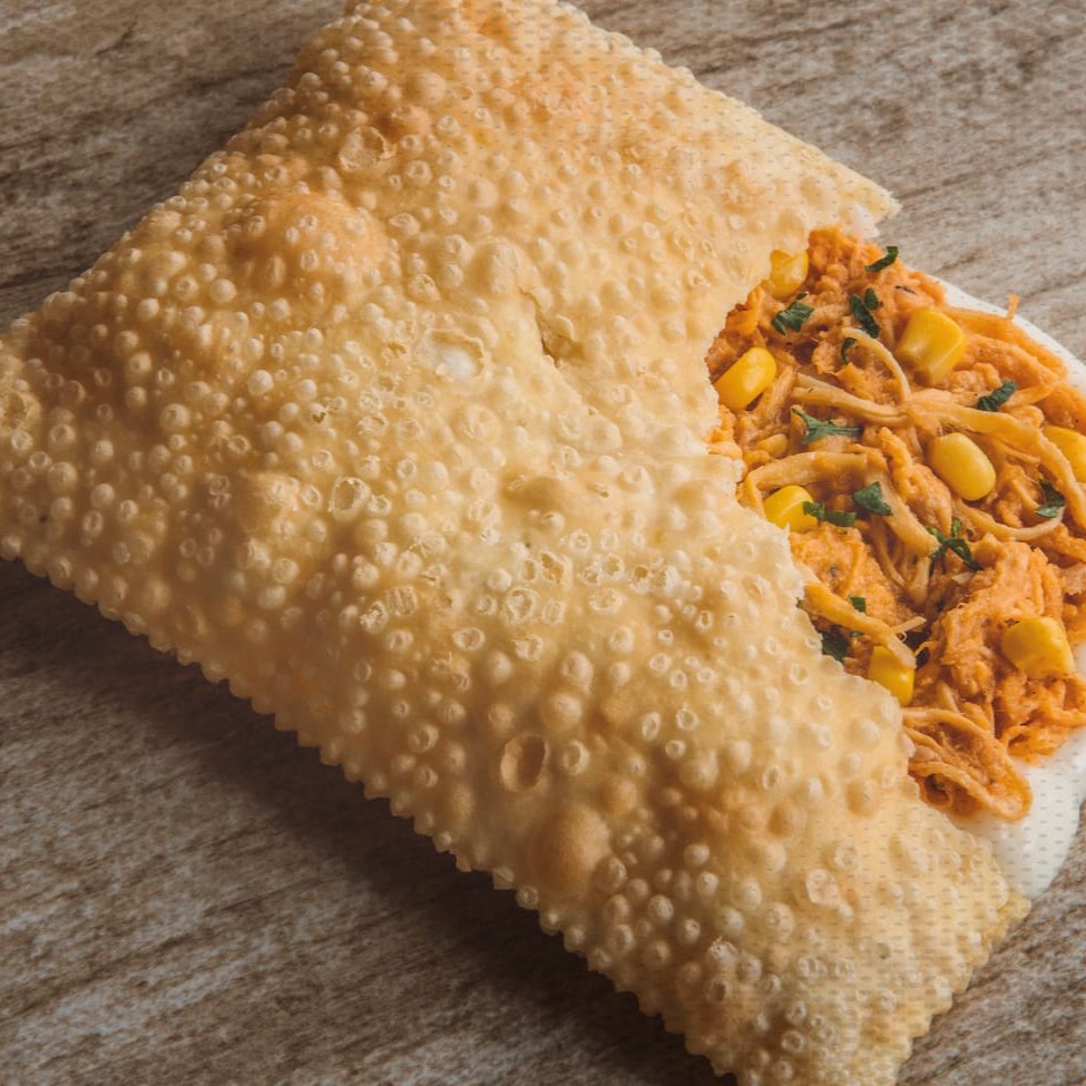 Saboroso pastel de massa crocante recheada com peito de frango desfiado, milho e requeijão cremoso.