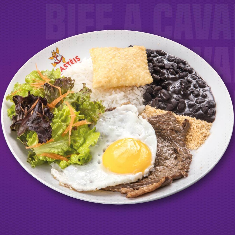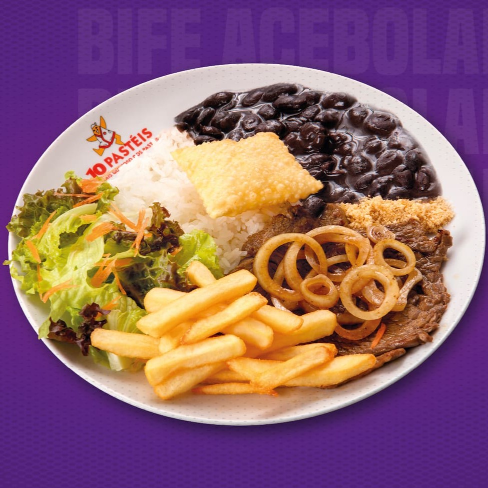 Nosso suculento bife acompanhado de arroz, feijão, batatas fritas e nosso delicioso pastel júnior de queijo.